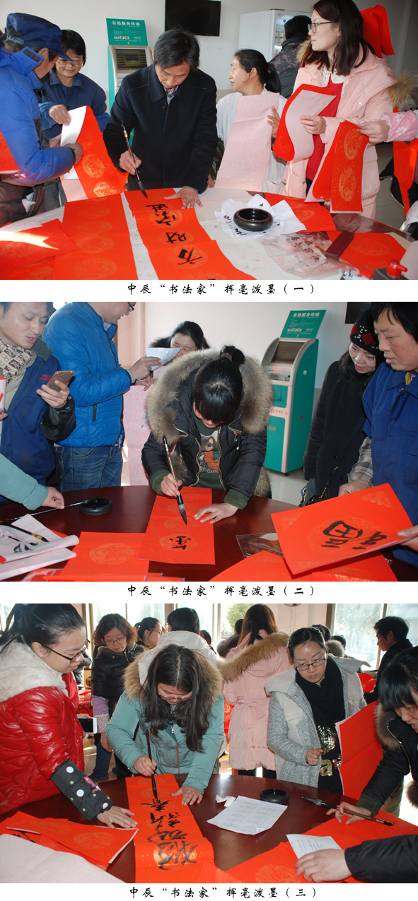 寫(xiě)春聯(lián)活動(dòng)一開(kāi)始,公司各書(shū)法愛(ài)好者們即以飽滿(mǎn)的熱情揮毫潑墨,創(chuàng )作出了一幅幅以辭舊迎新為主題的春聯(lián),“羊回玉宇留祥駐、猴降神州賜福多”、“金猴騰躍千般好、玉鷺?lè )w萬(wàn)象新”、“一帆風(fēng)順年年好、萬(wàn)事如意步步高”,絕妙的對聯(lián)受到了廣大員工的爭相稱(chēng)贊。春聯(lián)上,有筆畫(huà)簡(jiǎn)爽、婉雅秀逸的楷書(shū),有扁平精巧、雄闊嚴整的隸書(shū),也有雄強俊秀、行云流水般的行書(shū),更有風(fēng)格多樣、筆勢秀麗的草書(shū),書(shū)寫(xiě)者激情揮毫、盡情發(fā)揮。“想不到中辰還真是臥虎藏龍,居然還有這樣的書(shū)法高手!”圍觀(guān)員工嘖嘖稱(chēng)贊、品評挑選,一幅喜迎新春的熱鬧景象,整個(gè)大廳營(yíng)造出濃濃的年味兒。面對廣大員工的熱切期盼,中辰“書(shū)法家”們熱情高漲,一幅又一幅佳作不斷涌現。直到傍晚時(shí)分,墨盡紙光,大家意猶未盡,齊聲夸贊這樣的活動(dòng)開(kāi)展得好,喜悅之情溢于言表。