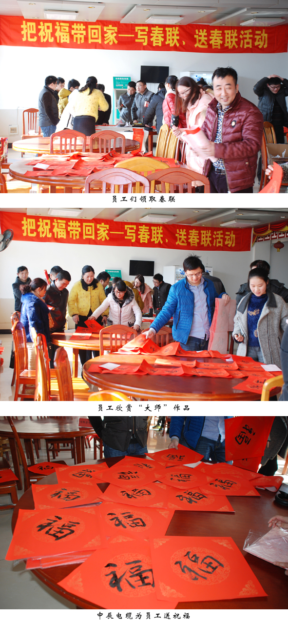 在2016年新春佳節到來(lái)之際,為營(yíng)造喜慶祥和的節日氣氛,江蘇中辰電纜有限公司經(jīng)過(guò)精心籌劃和準備,于1月26日在一樓職工食堂開(kāi)展了“把祝福帶回家”寫(xiě)春聯(lián)、送春聯(lián)活動(dòng)。