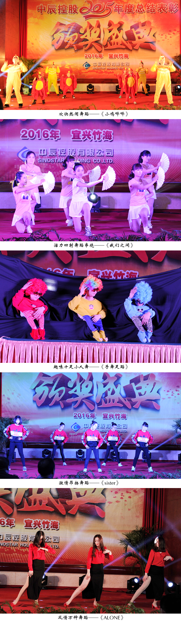頒獎盛典在沙畫(huà)《2015,騰飛的中辰》MV中拉開(kāi)帷幕。歡快熱鬧的《小雞嗶嗶》、優(yōu)美典雅的《雨巷》、活力四射的《我們之間》、激情昂揚的《sister》、風(fēng)情萬(wàn)種的《ALONE》,風(fēng)格各異的舞蹈帶來(lái)了無(wú)與倫比的視覺(jué)感受,更有幽默風(fēng)趣的小品《診所風(fēng)波》、飽含深情的彈唱《旅行的意義》、慷慨激昂的詩(shī)朗誦《黨在我心中》以及趣味十足的小人舞《手舞足蹈》,精彩紛呈。全體與會(huì )者的情緒一次次被點(diǎn)燃,現場(chǎng)熱浪滾滾,歡呼的聲音在會(huì )場(chǎng)經(jīng)久不息地蕩漾,不僅給大家帶來(lái)了歡聲笑語(yǔ),同時(shí)也讓同事之間彼此的心更加貼近。整個(gè)頒獎盛典張弛有度、料點(diǎn)十足、一氣呵成,表演者更是才華橫溢、大放光彩,晚會(huì )在合唱《超越夢(mèng)想》的歌聲中完美圓滿(mǎn)地落下帷幕。