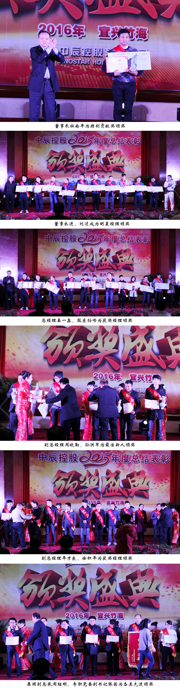 2月18日下午,中辰控股2015年度總結表彰頒獎盛典在宜興竹海國際會(huì )議中心隆重召開(kāi),大會(huì )全面總結了過(guò)去一年中公司各方面的工作成績(jì)和經(jīng)驗,理性分析當前面臨的形勢并部署2016年工作,同時(shí)大力表彰了2015年度各個(gè)條線(xiàn)上的先進(jìn)集體和先進(jìn)個(gè)人。江蘇中辰電纜有限公司、常州市拓源電纜成套有限公司、山東聚辰電纜有限公司及宜興市金魚(yú)陶瓷有限公司全體獲獎先進(jìn)個(gè)人、先進(jìn)集體及中高層管理人員、營(yíng)銷(xiāo)經(jīng)理參加了本次總結表彰頒獎盛典,總經(jīng)理姜一鑫主持會(huì )議,董事長(cháng)杜南平作2015年度總結報告并部署2016年度工作安排與要求,副總經(jīng)理周曉勤宣讀了表彰決定。