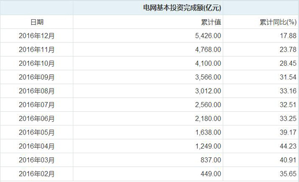 以下為2016年我國電網(wǎng)基本投資完成額累計值統計: