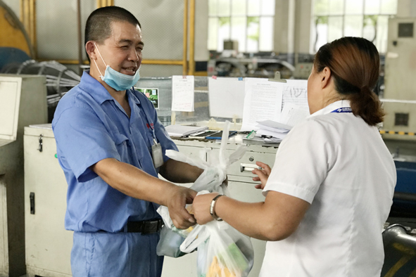 與此同時(shí),工會(huì )每天組織人員定時(shí)定點(diǎn)發(fā)放棒冰、鹽汽水、冰紅茶等飲品,并由食堂人員準備了綠豆湯、酸梅湯、大麥茶等冰鎮飲品,每日三次定時(shí)安排專(zhuān)人推送至各車(chē)間,服務(wù)到每個(gè)機臺員工。