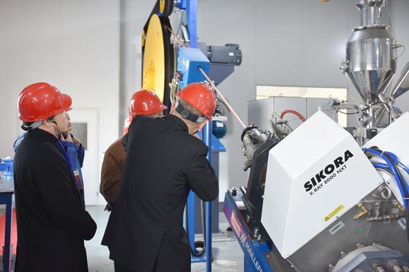 中國企業(yè)文化研究會(huì )評審專(zhuān)家組考察進(jìn)口交聯(lián)生產(chǎn)線(xiàn)