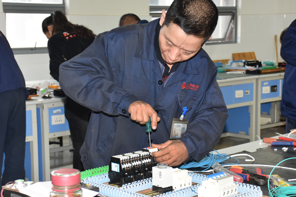 此次電工崗位技能競賽同樣采取理論與實(shí)操考試相結合的方式,理論考試著(zhù)重考察參賽選手電氣設備維護檢修及操作規程、供電系統與安全等知識的掌握情況,實(shí)操考試主要進(jìn)行智能控制電路的安裝與調試。比賽過(guò)程中,參賽選手全神貫注、全力以赴,經(jīng)過(guò)近兩個(gè)小時(shí)的比賽,均順利完成了考核項目。