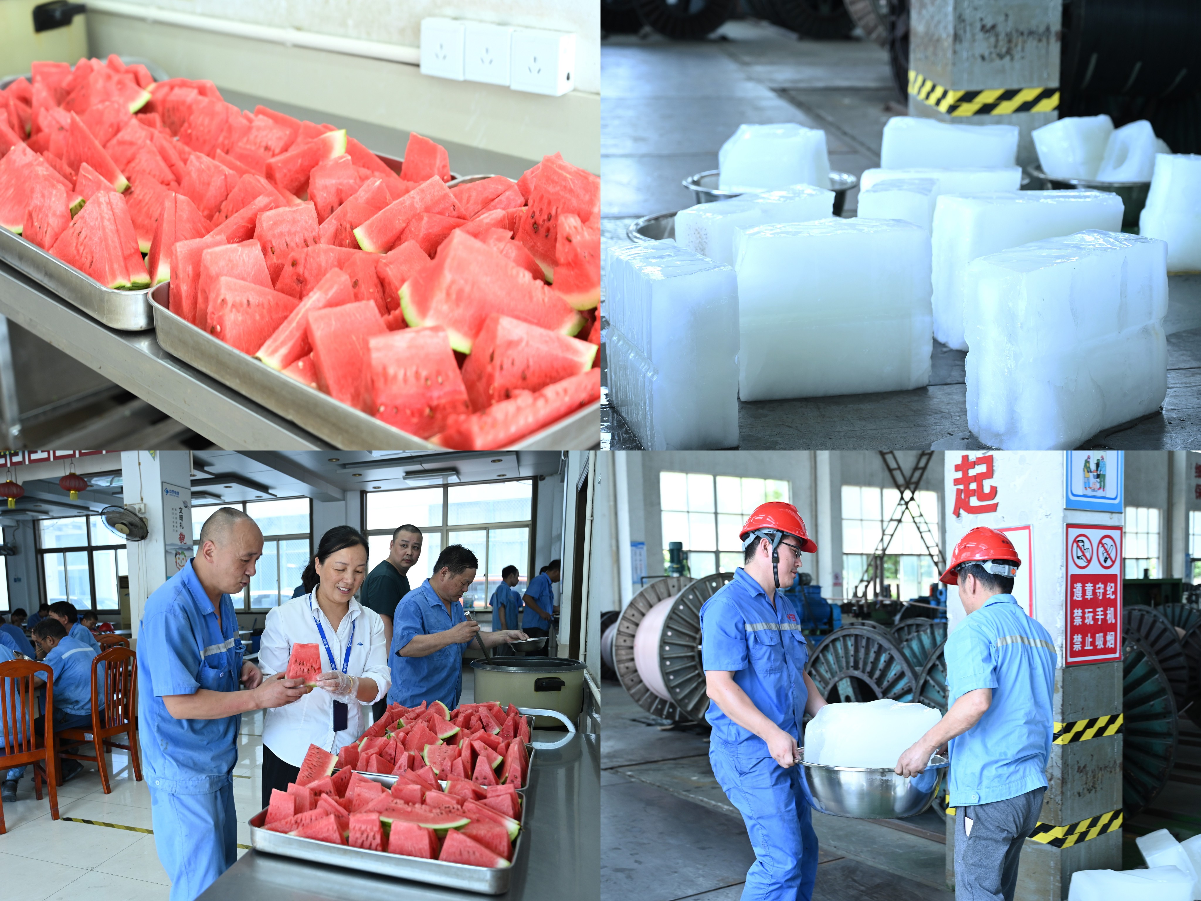 公司在食堂提前準備切好的西瓜,午餐時(shí)間段自行領(lǐng)取,并且在高溫天氣每日兩次的為一線(xiàn)員工提供冰塊,希望能在這個(gè)酷暑帶給他們一絲清涼。